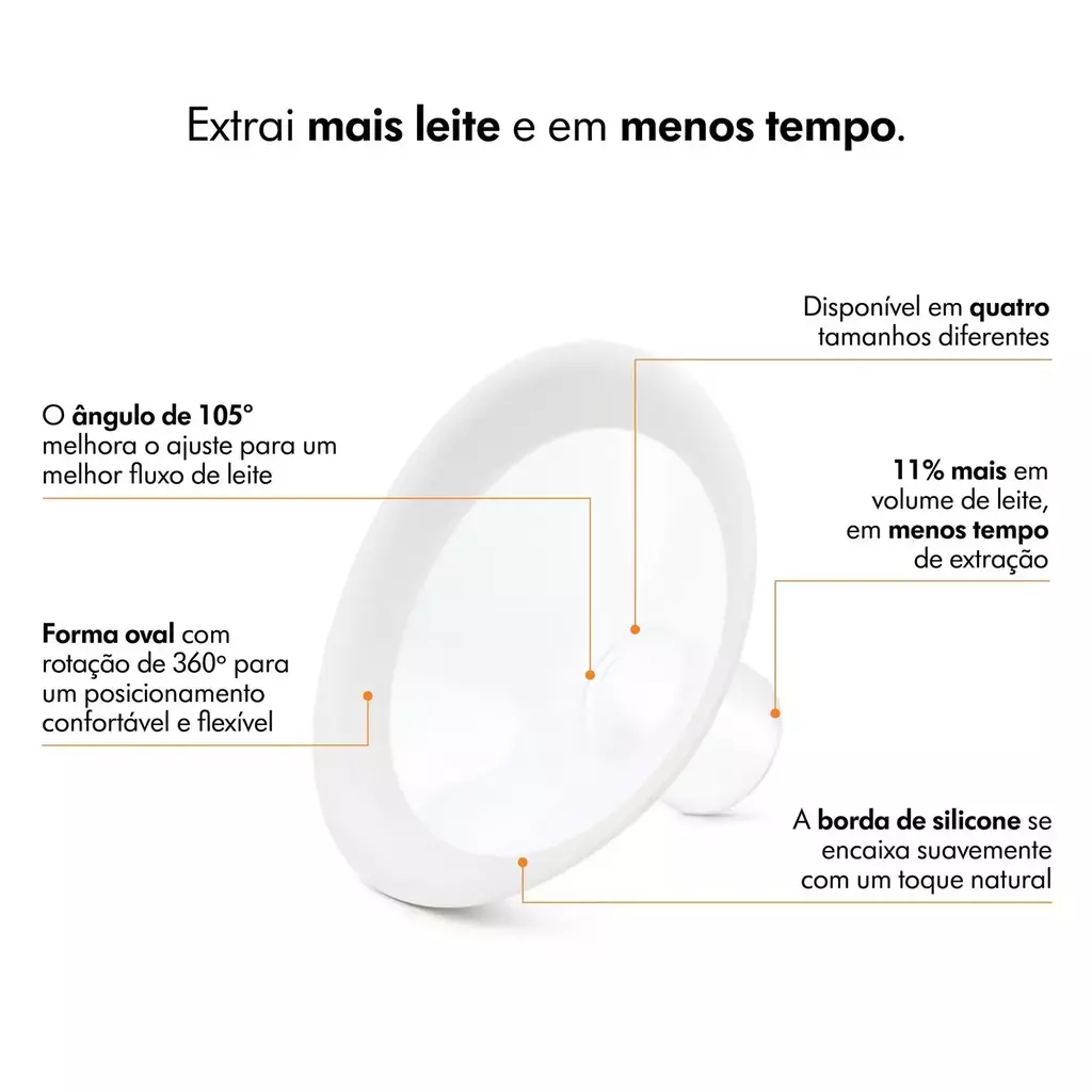 - Os funis PersonalFit Flex se ajustam melhor ao peito graças a seu ângulo oval de 105o, uma borda suave e flexível. Podem rotacionar 360° para um melhor ajuste ao formato de sua mama